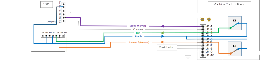 The Machine Control Board generates a 0 to 5V signal over wires J1-1 and J1-2, where J1-1 is for the speed command (Vdc proportional), and J1-2 is the ground (common) reference wire. These wires are connected from the J1 connector (located on the Machine Control Board) to terminals T1 and T2 on the VFD.