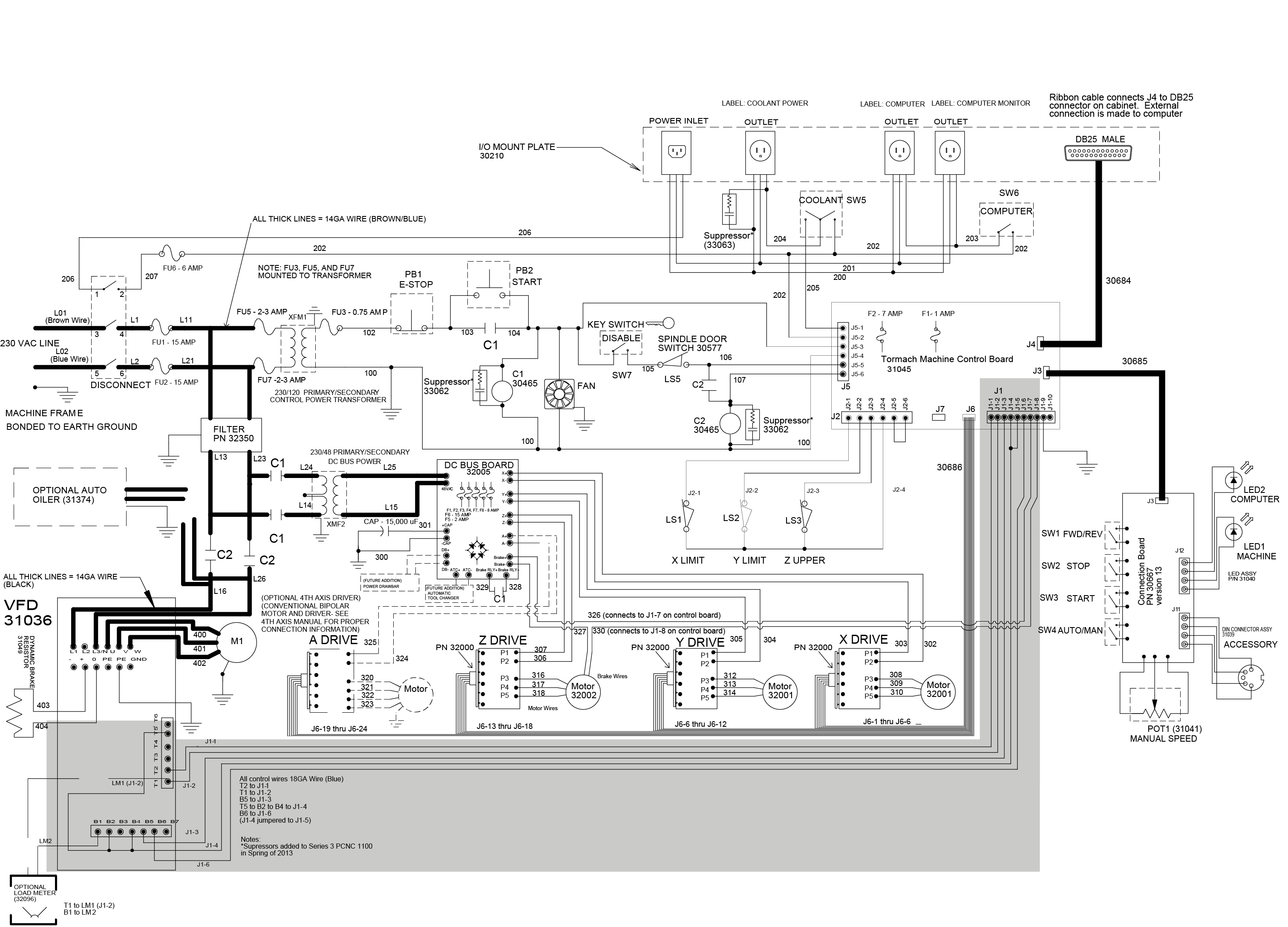 The Machine Control Board powers on contactor C2, through which the VFD is powered by 230Vac. A contactor is like a large relay: While its coil is powered by small control signal (100 mA at 115 Vac), it switches a much larger current (15 ampere at 230 Vac).